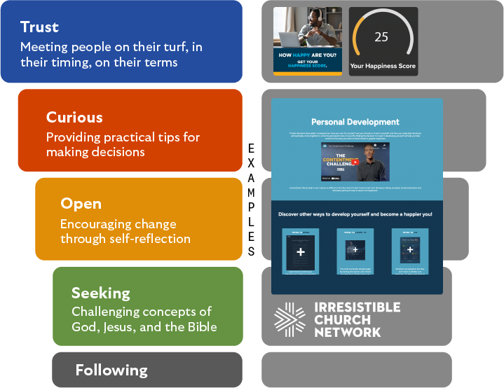 According to YMC’s primary research, the Religiously Unaffiliated have no interest in faith, God, or Jesus, and they seek answers to life’s questions via internet searches and social media. They are looking for a credible, reliable source of information to solve their problems. So YMC’s first step is to simply establish trust, in essence, inviting them to Trust a Christian by providing low-pressure, practical ways to make their lives better based on the teachings of Jesus.
